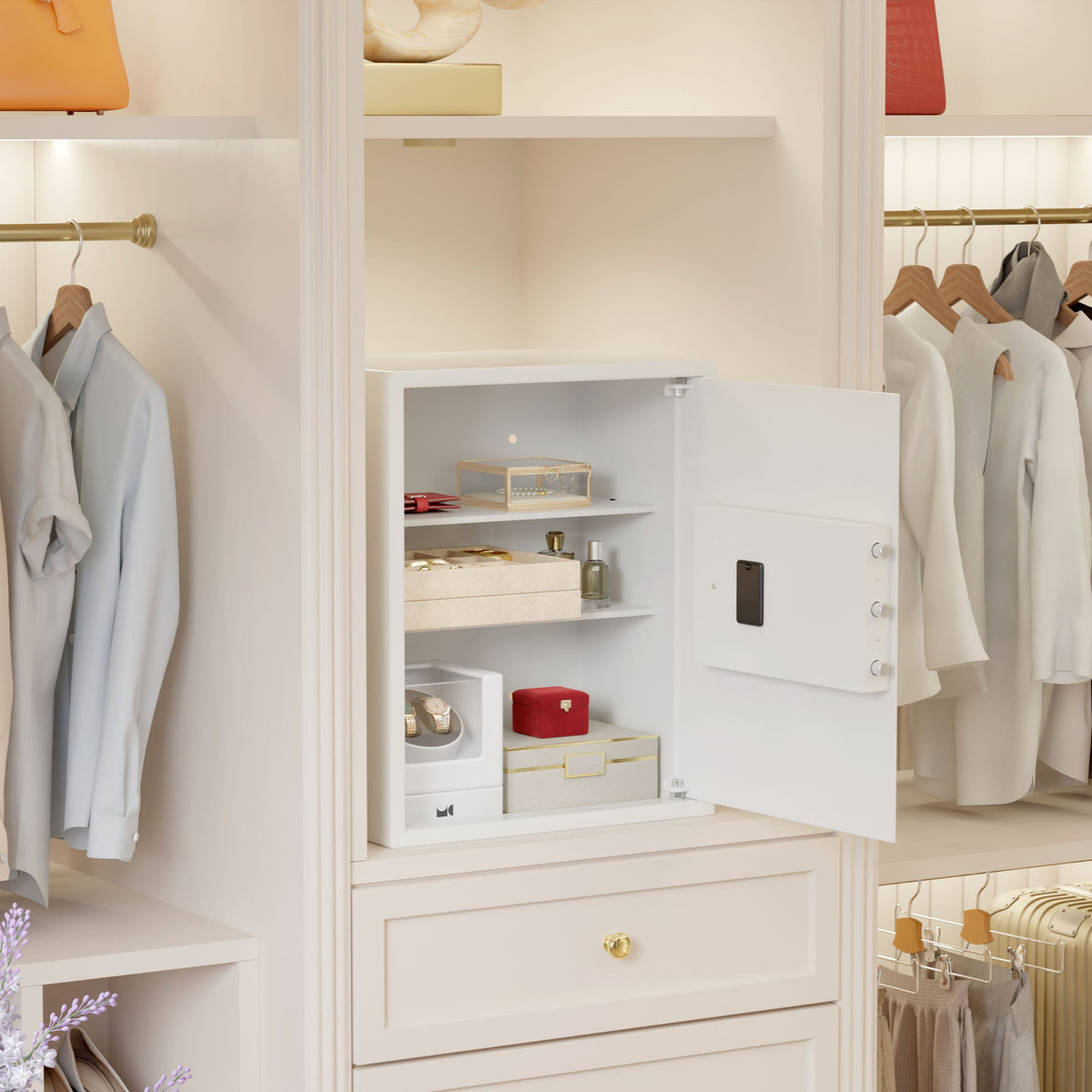 Mycube Grand is the largest model in the Touch line, bringing biometric convenience to a thoughtfully spacious interior. It safeguards jewelry, cash, documents, and devices with ⅛-inch rolled steel and tamper-proof door bolts. An elevated, architectural look to complement your home.